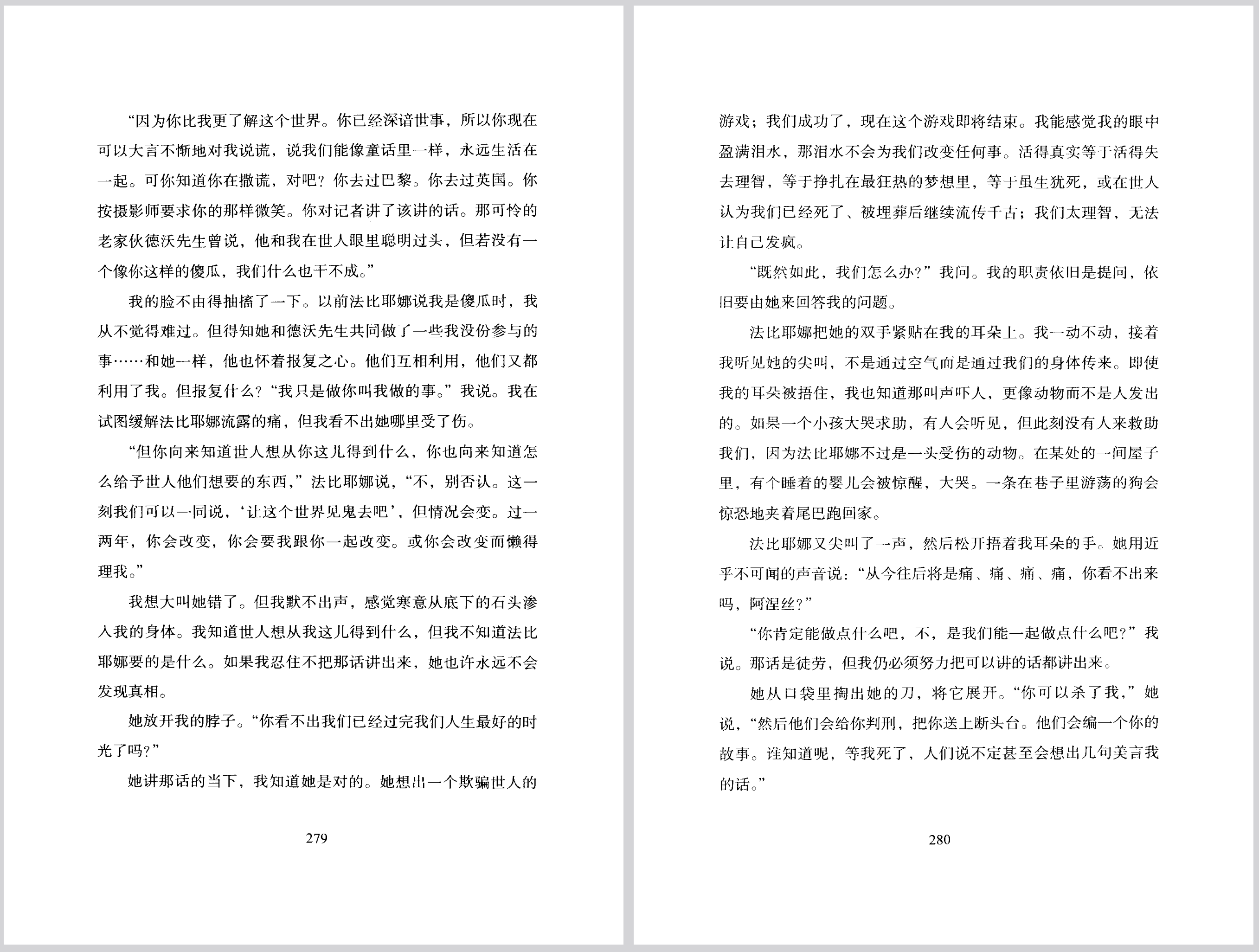 我现在明白,我们的故事在很大程度上始于法比耶娜的狂喜与绝望,两者我都达不到。只要我可以让她通过我来发泄她的狂喜和绝望,生活对她来说就可以忍受,甚至有意思。我是磨刀石,我把她刀子般的心磨得锋利;我是那颗她毫不费力切开的橙子。尽管如此,我照样救不了我们。击败我们的不是无聊,使我们分道扬镇的不是落败。不是每个小孩生来骨子里都有一股难以驯服的力晕。世人的职责是不要正视,把那股力最当作小孩子闹脾气,当作不成熟而勾销。儿童的职责是克制那股力量,直至能把它扼杀,昂首成为大人,让自己更加安全。法比耶娜找不到语言描述她的狂喜和绝望,我没有办法理解她的狂喜和绝望,但活在这极端中的人不只她一个。其中幸运的人等待风暴过去。真正幸运的人学会几招技巧,驯服这不可驯服的力量——无论多么昙花一现——扬名天下。我不够老练世故,无法声称我理解那些天才,但我知道,他们在交响乐和协奏曲里所表达的,他们在画布上或书里所呈现的,正是使法比耶娜在墓园发出尖叫的东西。隔着她的手,我听见她的痛:她的心中有个庞然大物,比我们实际的人生更大、更鲜明、更永恒。她既找不到也创造不出一片能容纳那庞然大物的天地。