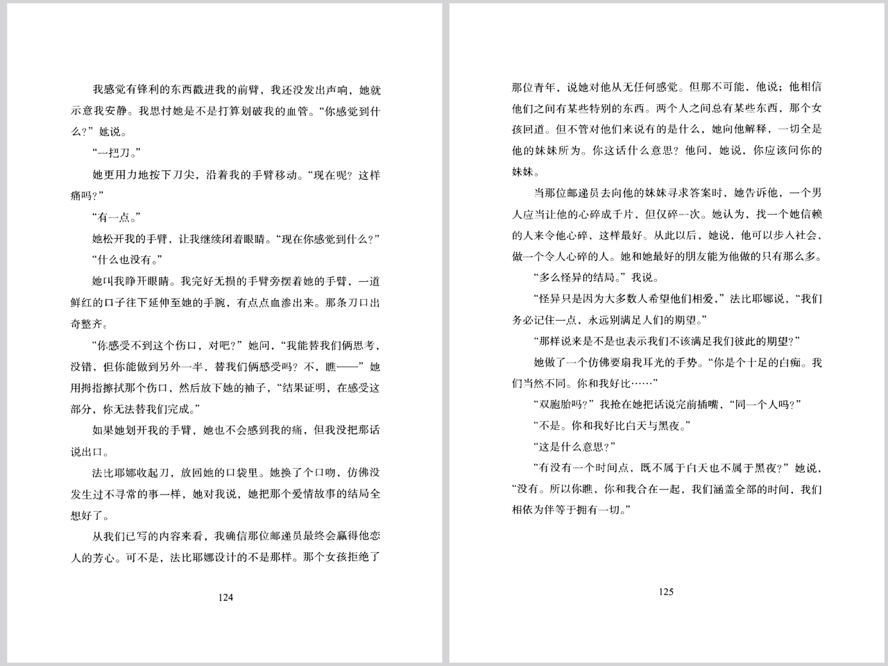 全世界的人里,有多少人扪心自问,能够斩钉截铁地说他们这辈子从未背叛过谁——十个、五个、一个也没有?倘若如此,我们为什么经常对背叛小题大做?这么多电影和书,这么多破碎的婚姻和决裂的友谊。我们互相在背后捅刀子——也许这些刀子有它们自己的意志。它们巡游四方,在各地觅得一只手、一个背。我们无法责备那些手,诚如我们无法同情那些背。它们是同样被招募来供那些刀子取乐的。这个世界绝不缺少刀子。